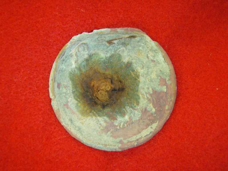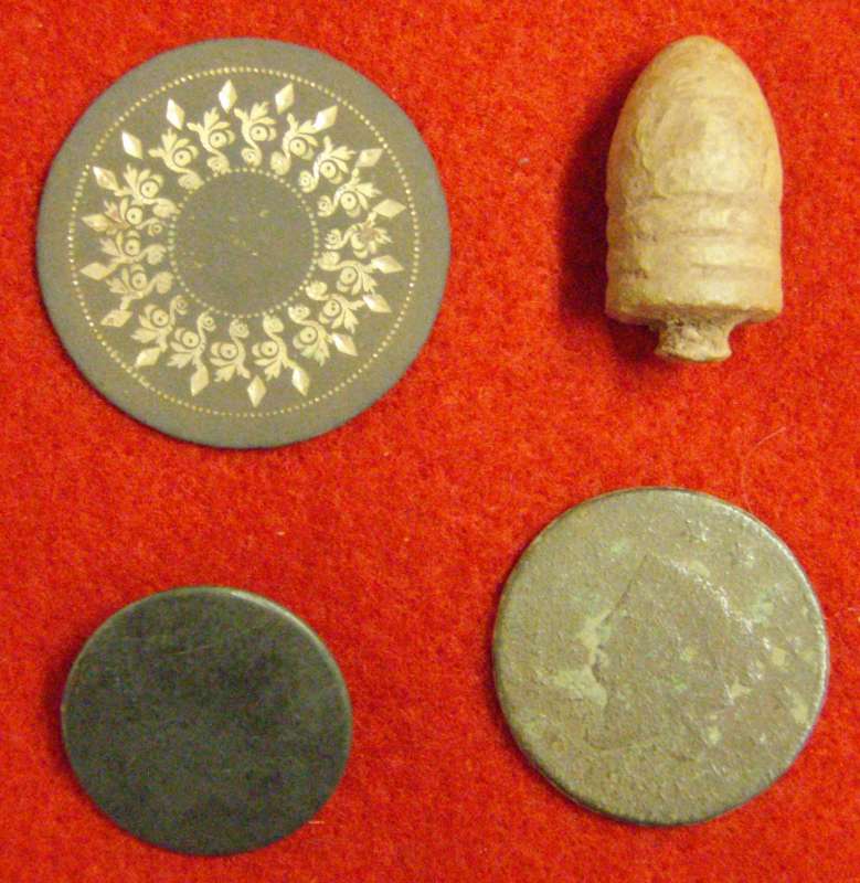 Brad Trostle found this beautiful 1-3/8" diameter great coat button with gilt, a Type I Williams Cleaner bullet, a pewter button, and an 1820 large cent in the first 3 days of July, 2015, all on a farm near Gettysburg.