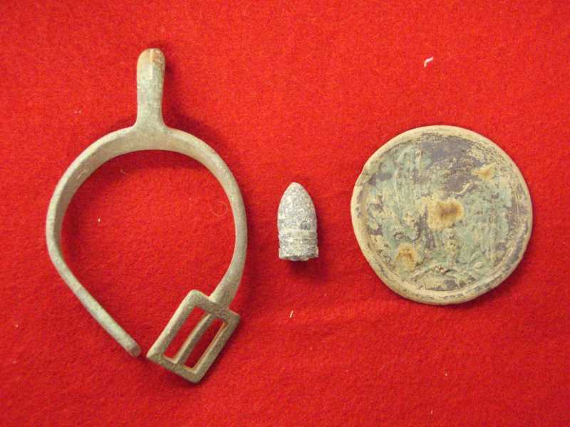 Dave Baker recovered this Union officer's spur, breast plate, and a Gardner explosive bullet in northern Maryland with his Teknetics T2. Explosive bullets were used in only two battles: Chancellorsville and Gettysburg. After Gettysburg, both sides determined they were too inhumane, and both sides agreed not to use them. They are occasionally found in camps between Chancellorsville and Gettysburg. Nice finds!