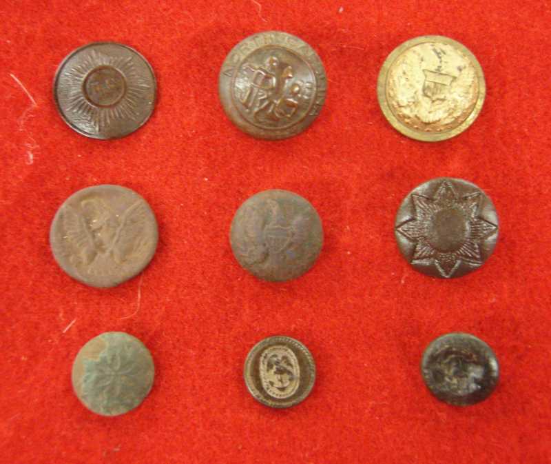Gary Beaverson recovered these buttons with his F-75 Fisher. Included are a North Carolina sunburst pattern, North Carolina State Seal, Staff Officer button with gilt, two eagle buttons, 2 flower buttons, an early Navy button, and a Virginia State Seal cuff button.