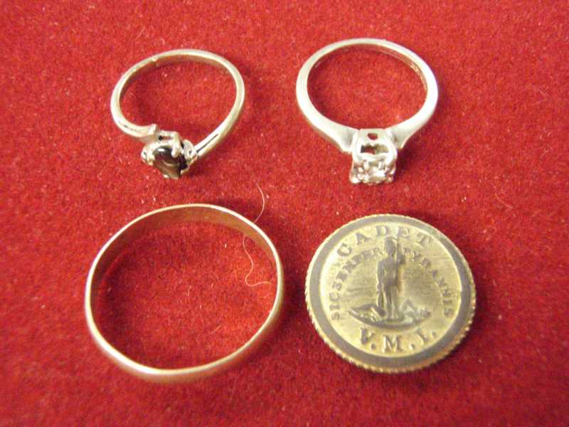 Joe Rhodes located this rare VMI (Virginia Military Institute) button with his Minelab Go-Find 40 in the New Market, Virginia area. The gold rings were found with his White's DFX in the Harrisonburg, Virginia area.