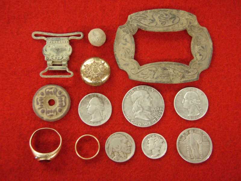Wayne Needy recovered these artifacts from Maryland Civil War sites with his Garrett AT Pro. Included are a scarce Union Dragoon button, eleven bullet varieties, a kepi buckle, a Springfield musket wrench, iron Hotchkiss canister, brass throat from a sword scabbard, coins, and miscellaneous buttons. The Garrett AT Pro is a super detector for finding relics, as well as coins, rings, and jewelry. Nice going, Wayne!