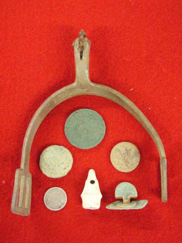 Duane Geiling recovered these coins, buttons, and artifacts at an early homesite several miles north of Gettysburg using his Garrett AT Pro. Included are a scarce Civil War Dragoon cuff button and an iron grape shot. Among the coins found were a beautiful 1864 2 cent piece, four nice Indian head pennies dating from 1861 to 1906, three 1943 zinc plated steel pennies found in dry ground under a porch, a 1937 buffalo nickle, and silver dimes. The buttons include a pewter post Revolutionary War 7th Cavalry button, a mid-18th Century French hollow cast button. Also found were an early thimble, brass black powder container, and a rosette with English letters on it.