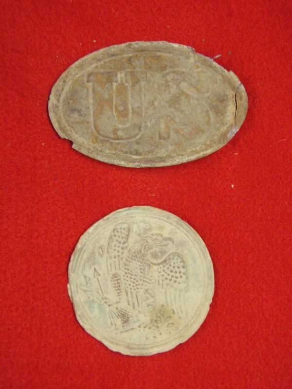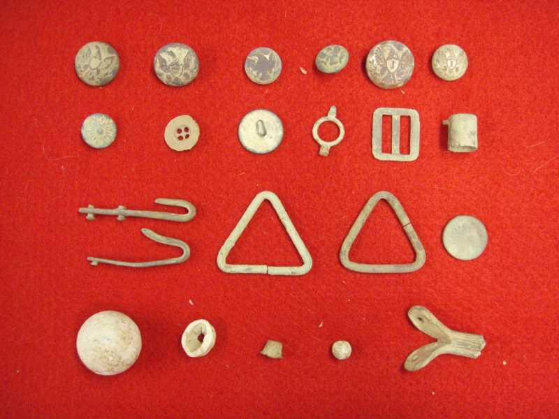 Chase Woods dug this Union Eagle Breast Plate and Union US bucket with arrow hooks. He also recently recovered a number of .58 caliber Union bullets, Williams Cleaner bullets Type II and III, Spencer and Sharps .52 caliber bullets, .44 caliber pistol bullets, musket balls, and fired bullets. There were also a number of nicer Civil War artifacts, including Eagle buttons, Eagle I buttons with gold gilt, iron underwear button, watch key, kepi buckle, rare pinfire cartridge, knapsack hooks, sling hooks, Indian Head penny, etc. All great finds, all found with his Garrett AT Pro.