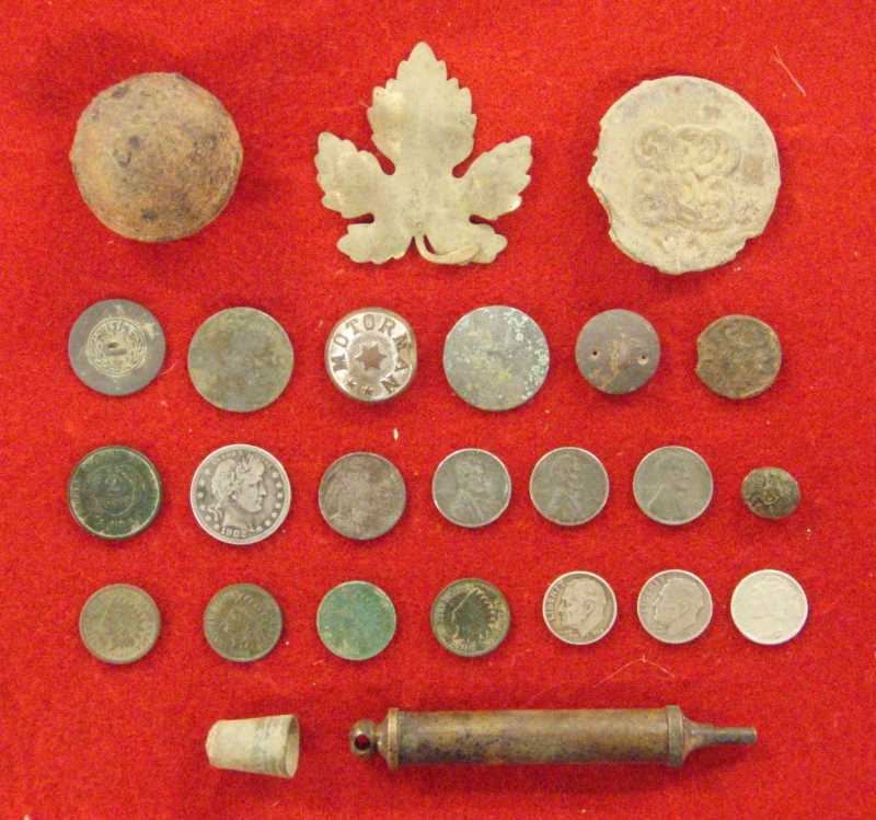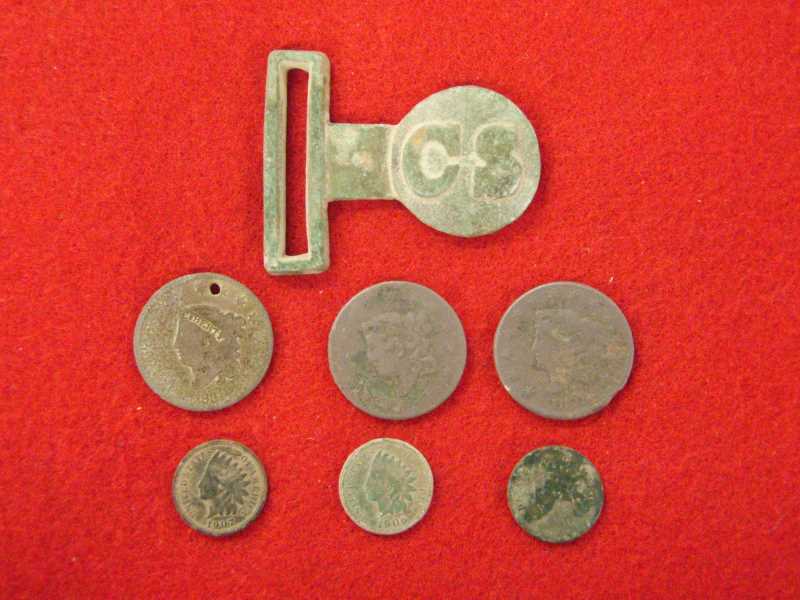 Duane Geiling recovered these coins, buttons, and artifacts at an early homesite several miles north of Gettysburg using his Garrett AT Pro. Included are a scarce Civil War Dragoon cuff button and an iron grape shot. Among the coins found were a beautiful 1864 2 cent piece, four nice Indian head pennies dating from 1861 to 1906, three 1943 zinc plated steel pennies found in dry ground under a porch, a 1937 buffalo nickle, and silver dimes. The buttons include a pewter post Revolutionary War 7th Cavalry button, a mid-18th Century French hollow cast button. Also found were an early thimble, brass black powder container, and a rosette with English letters on it.