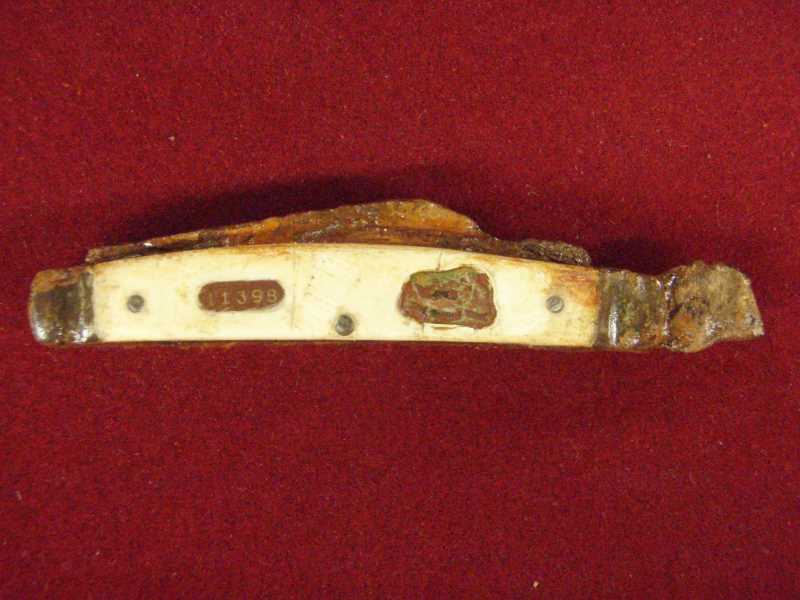 Stanley Snouffer dug this early penknife with a thick bone handle at a pre-Civil War homesite in northern Maryland. The knife has a serial number on the left, and on the right an emblem with E. Pluribus Unum on the bottom, and what looks like two mallard ducks on the top. Interesting.