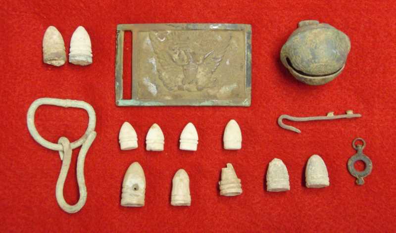 Wayne Needy, while at Antietam / Sharpsburg, MD, located these artifacts with his Garrett AT Pro. Union sword belt plate, brass sword hanger, rifle sling, Spencer bullets, Burnside bullets, watch key, .44 caliber pistol bullets, carved bullets, and a pewter sleigh bell - all great finds!